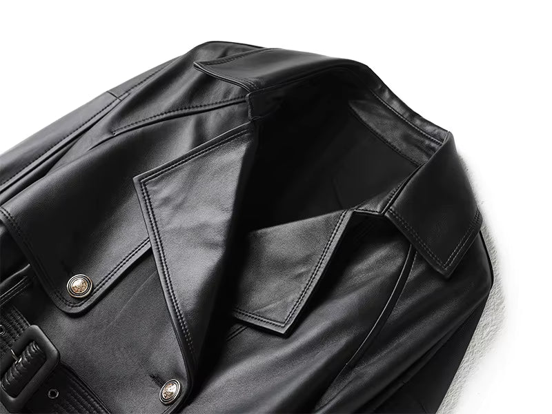 Cropped Genuine Leather Double-Breasted Belted Jacket