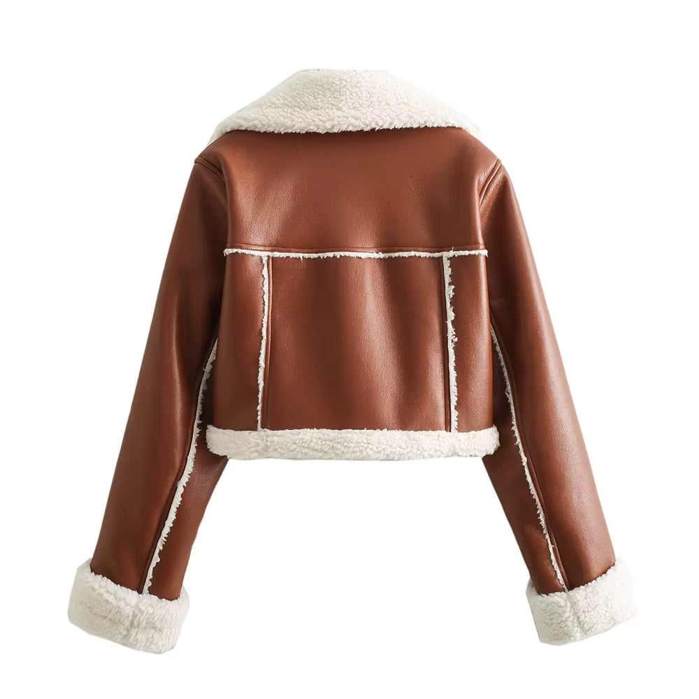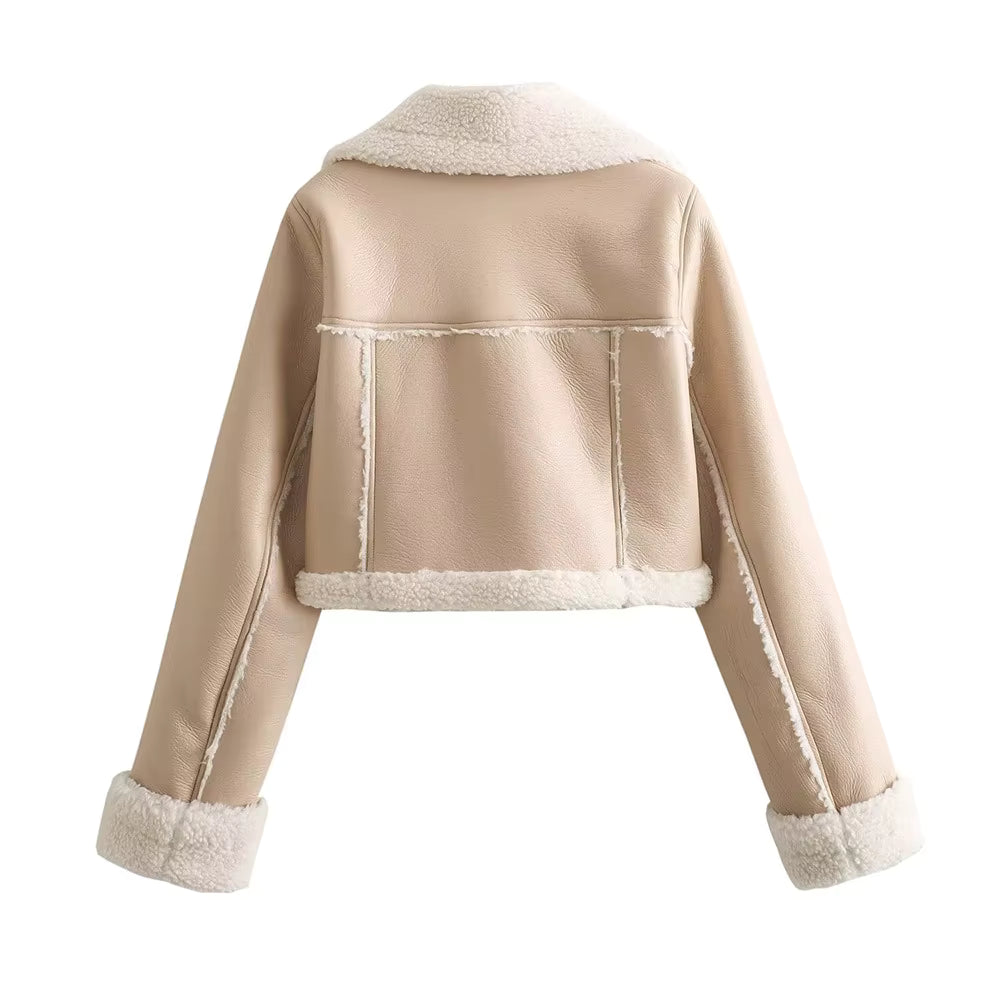 Featuring a wide shearling-style lapel, plush inner finish, clean leather-effect outer surface, long sleeves and refined cuff details, this piece brings depth and dimension to your wardrobe. The cropped cut adds a modern proportion that pairs beautifully with high-waisted denim or tailored trousers.