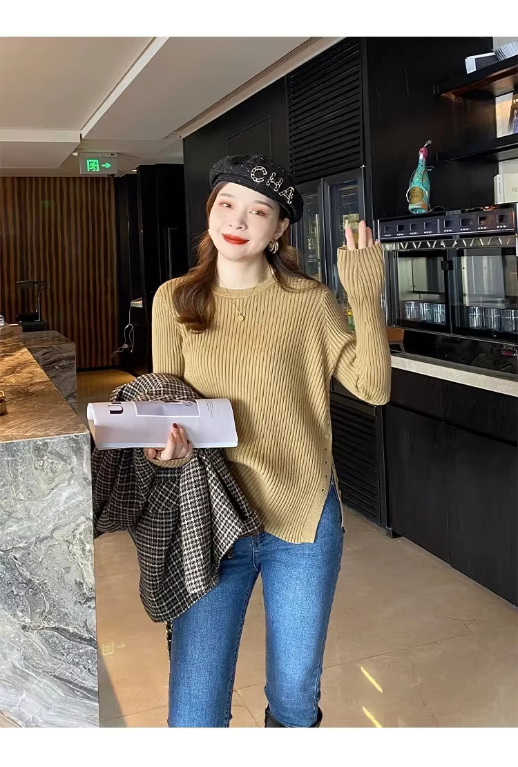 Featuring long sleeves, a gently stretchy knit texture, decorative side buttons and a stylish split-hem detail, this pullover adds personality while maintaining a clean, refined silhouette. The fitted shape enhances comfort and flatters your natural lines.